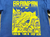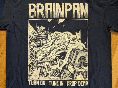 Wearing this shirt will make a statement! That statement being "I am wearing a shirt." Display Mike Lawrence's killer artwork for "Turn On, Tune In, Drop Dead" prominently on your thorax. White ink on a navy blue Gildan brand shirt.
